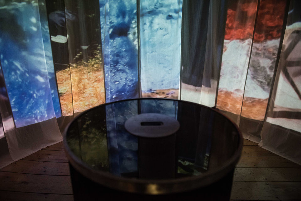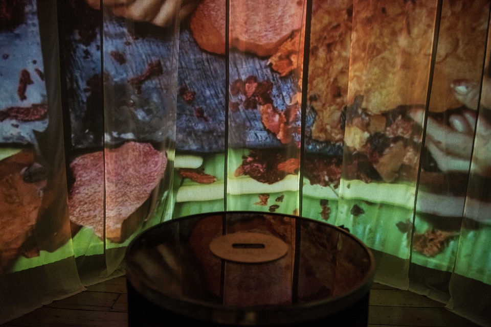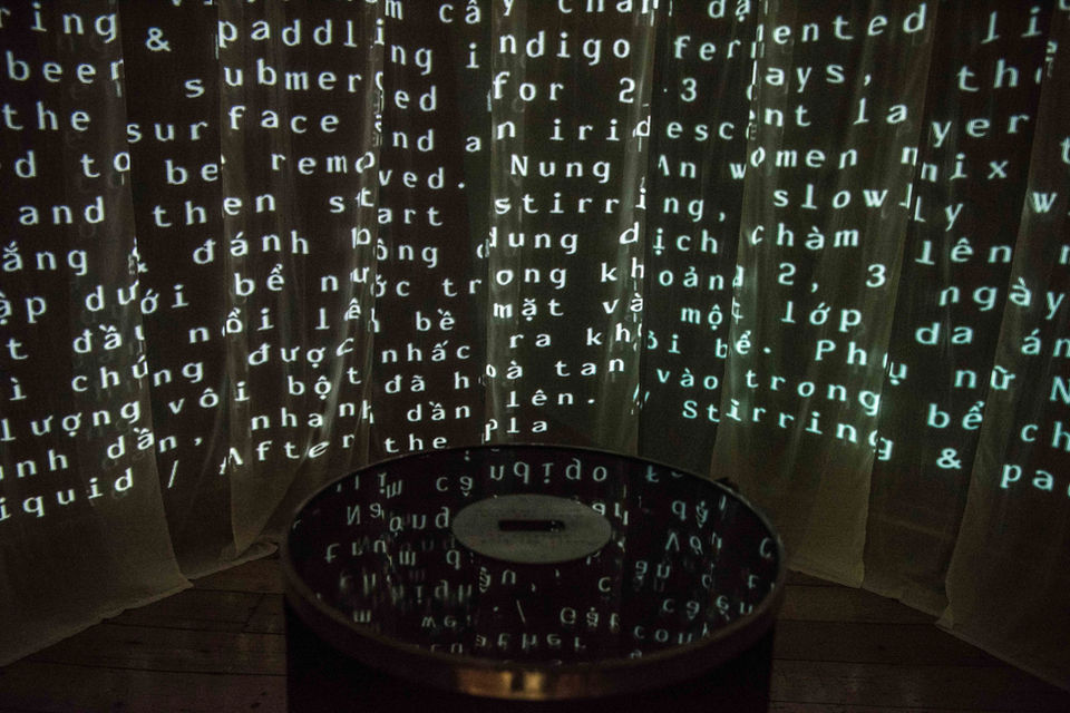 The Study is an interactive video installation showing the processes involved in The Lab. As design moves further to a more digital and sometimes sterile practice The Study openly engages the viewer with the tactile and subversive elements of making involved in sustainable design processes. Naturally dyed fabric hangs in layers around the room and video mapping shows the natural dye processes used to create the fabric. This is overlaid with investigations into Vietnamese language and type, playing on the diacritics and the tonal uniqueness of the Vietnamese language.